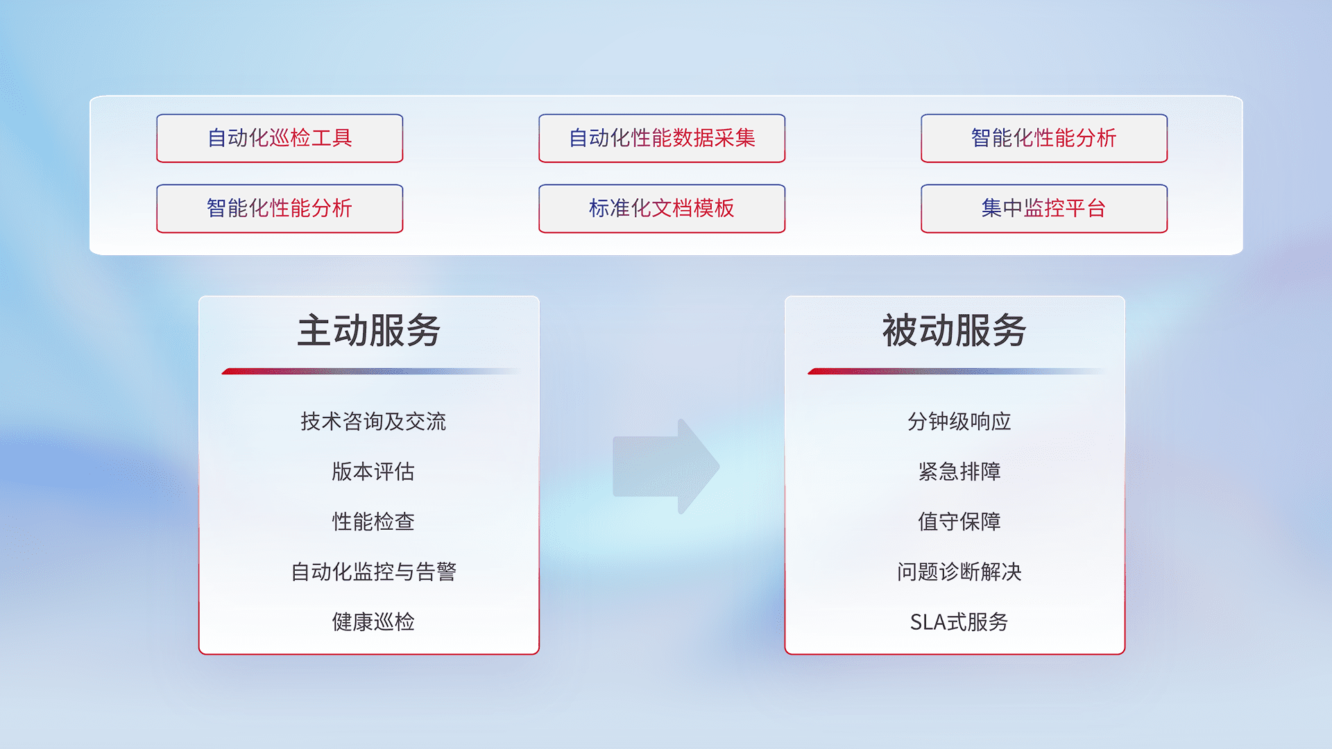 智能化工具和标准化文档,,保障服务质量,,,提供主动服务(包含技术咨询、、、版本评估、、、、性能检查、、自动化监控与告警、、、、健康巡检)和被动服务包含(分钟级响应、、、、紧急排障、、、值守保障、、、问题诊断解决、、SLA服务)。。