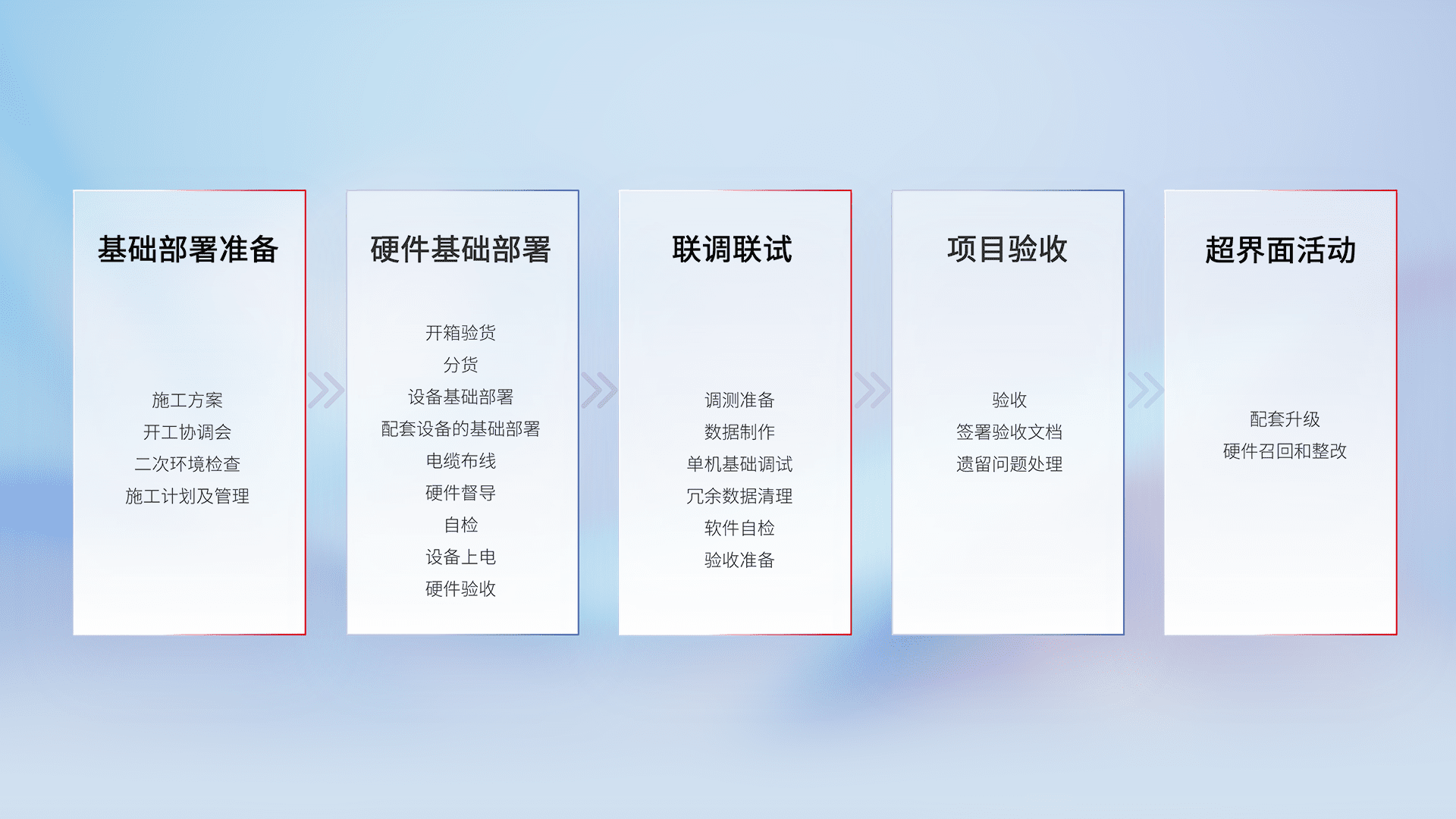 从基础部署准备、、硬件基础部署、、、、联调联试、、、项目验收、、越界面活动的全过程可追溯,,,,保证施工质量和进度。。。。